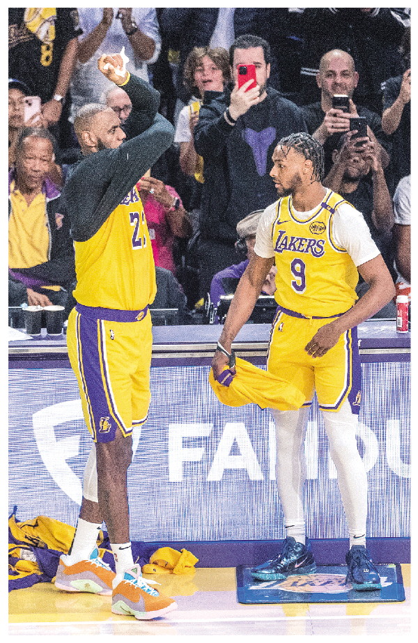 湖人队球员勒布朗·詹姆斯(左)与儿子布朗尼·詹姆斯准备上场比赛。 新华社发