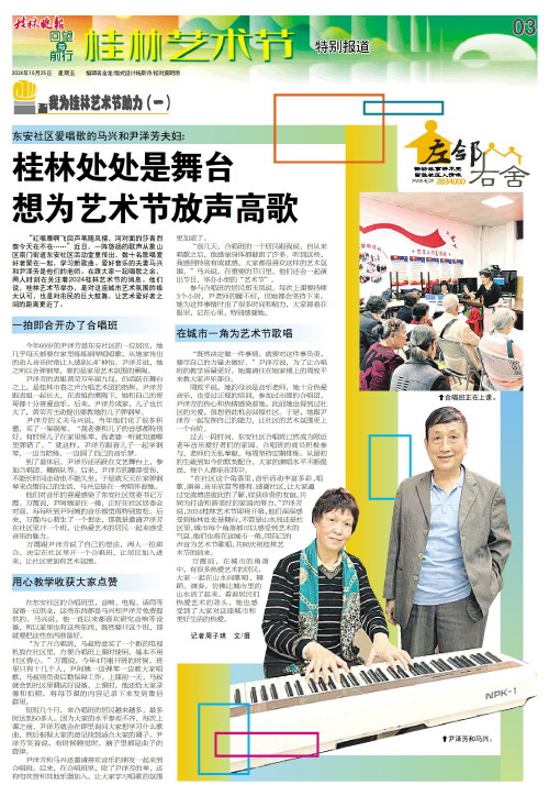 “在社区这个角落里,音乐活动丰富多彩,唱歌、演奏、音乐欣赏等都有。感谢社区,让大家通过交流增进彼此的了解,收获珍贵的友谊,共同为打造和谐美好的家园而努力。”尹泽芳说,2024桂林艺术节即将开幕,他们深深感受到桂林处处是舞台,不管是山水间还是社区里,城市每个角落都可以感受到艺术的气息。他们也将在这城市一角,用自己的声音为艺术节歌唱,共同庆祝桂林艺术节的到来。