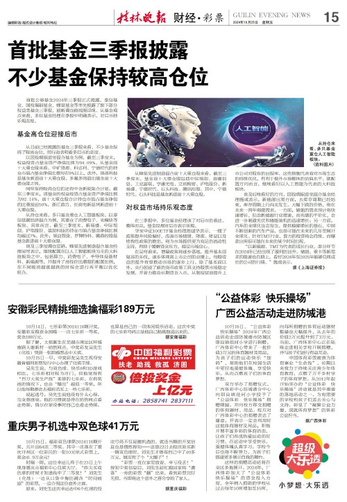 不少基金保持较高仓位   首批公募基金2024年三季报正式披露。泰信基金、国投瑞银基金、蜂巢基金等率先披露了旗下部分权益类基金三季报,最新调仓路线图浮现。从基金观点来看,多位基金经理在季报中明确表示,对后市持乐观态度。