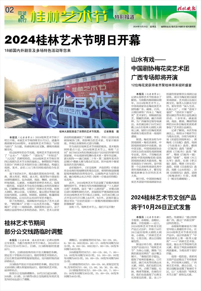 2024桂林艺术节明日开幕 18部国内外剧目及多场特色活动等您来   本报讯(记者唐霁云)2024桂林艺术节将于明日开幕,本届艺术节将持续至11月3日。适逢西南剧展举办80周年,本届桂林艺术节将以“回望与前行”为主题,传承桂林历史文脉,赓续西南剧展荣光。