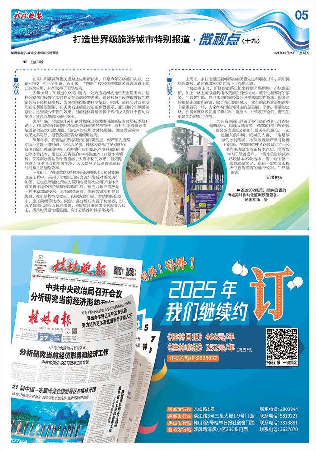今年以来,桂林公路部门全力推进“公路+科技”,利用新工艺、新设备、新技术、新材料持续提升养护质量和路况水平,让这条“最美旅游公路”不但有最好的风景,还有舒适的驾车体验。