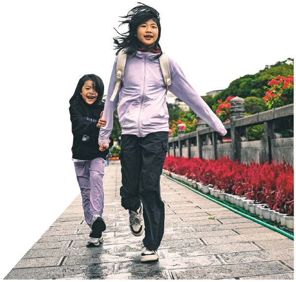 要去看演出了,两姐妹开心地跑向七星景区内的树剧场。