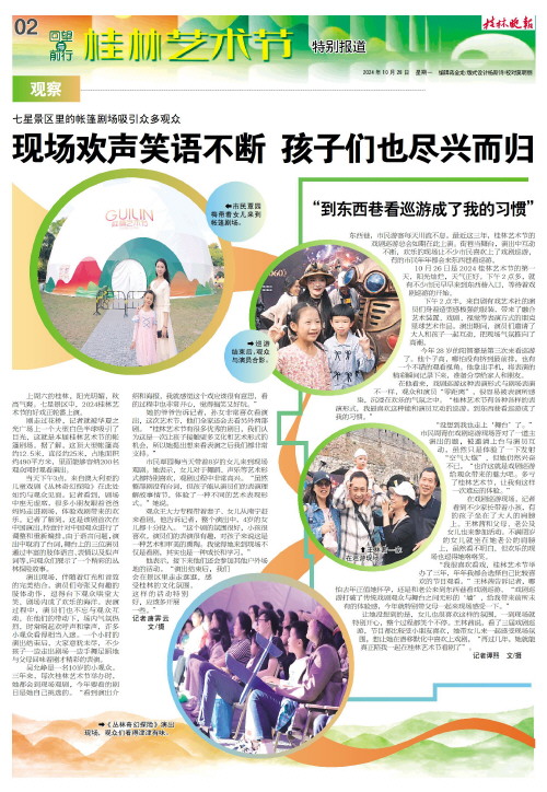 七星景区里的帐篷剧场吸引众多观众 现场欢声笑语不断 孩子们也尽兴而归   上周六的桂林,阳光明媚,秋高气爽。七星景区中,2024桂林艺术节的好戏正轮番上演。