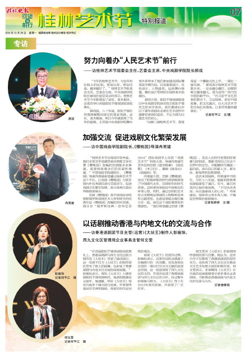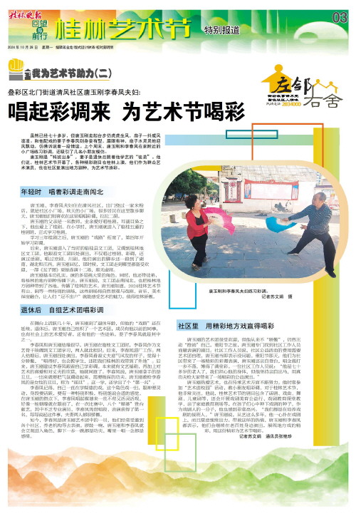 舞台上 演员奉献完美演出 剧场里 观众看得非常过瘾 社区里 居民唱起彩调助力 桂林艺术节精彩上演 市民乐享“艺术大餐” ●详见 2-8 版