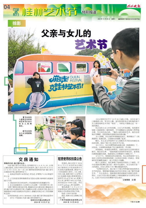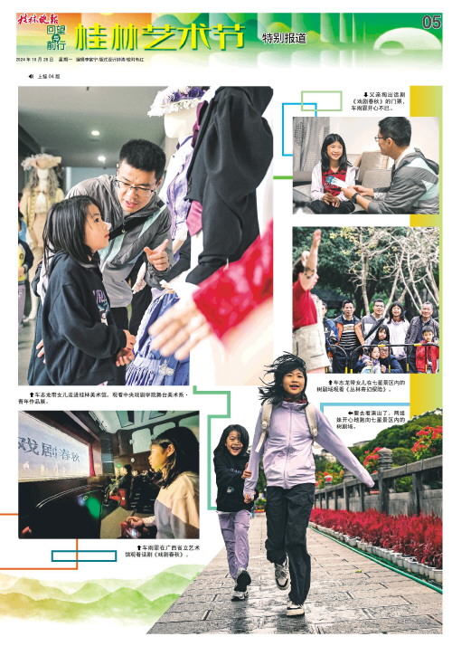 父亲与女儿的艺术节   2024桂林艺术节于10月26日盛大开幕,市民在家门口就能看大戏、享文化大餐。家住铁西的车志龙和他的两个女儿都是桂林艺术节的“粉丝”,当然也不愿错过这一年一度的盛会。