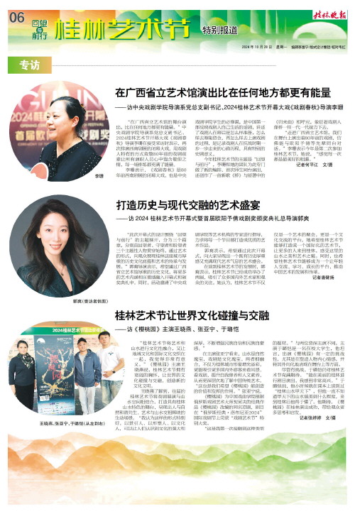 在谈到桂林艺术节的发展时,郭爽表示,桂林艺术节已经成功举办了两届,吸引了众多国内外艺术家和观众的关注。她认为,桂林艺术节不仅仅是一个艺术的聚会,更是一个文化交流的平台。她希望桂林艺术节能够打造成一个国际化的艺术节,让更多的人来到桂林,感受这里的山水之美和艺术之魅。同时,也希望桂林艺术节能够成为一个让年轻人交流、学习、成长的平台,推动中国艺术的发展和传承。