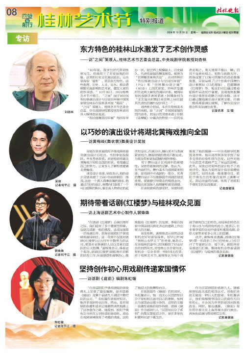 东方特色的桂林山水激发了艺术创作灵感 ——访“之间”策展人、桂林艺术节艺委会总监、中央戏剧学院教授刘杏林   “40年前,我学生时代曾到桂林写生,给我留下了非常深刻的印象。这里的历史文化源远流长,山水显得很‘温和’,更具东方特色。这些地理、历史、人文、山水,都会潜移默化地影响到艺术家,激发大家的创作灵感。”10月26日,2024桂林艺术节开幕日,“之间”BETWEEN布拉格演出设计与空间四年展中国国家展也同步在桂林美术馆“揭面”。“之间”策展人、桂林艺术节艺委会总监、中央戏剧学院教授刘杏林面对各大媒体由衷地说。