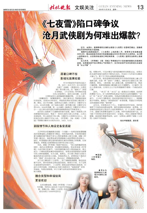 沧月武侠剧为何难出爆款?   近日,由李沁、曾舜晞领衔主演的古装剧《七夜雪》在爱奇艺播出。剧集根据沧月创作的同名小说改编。