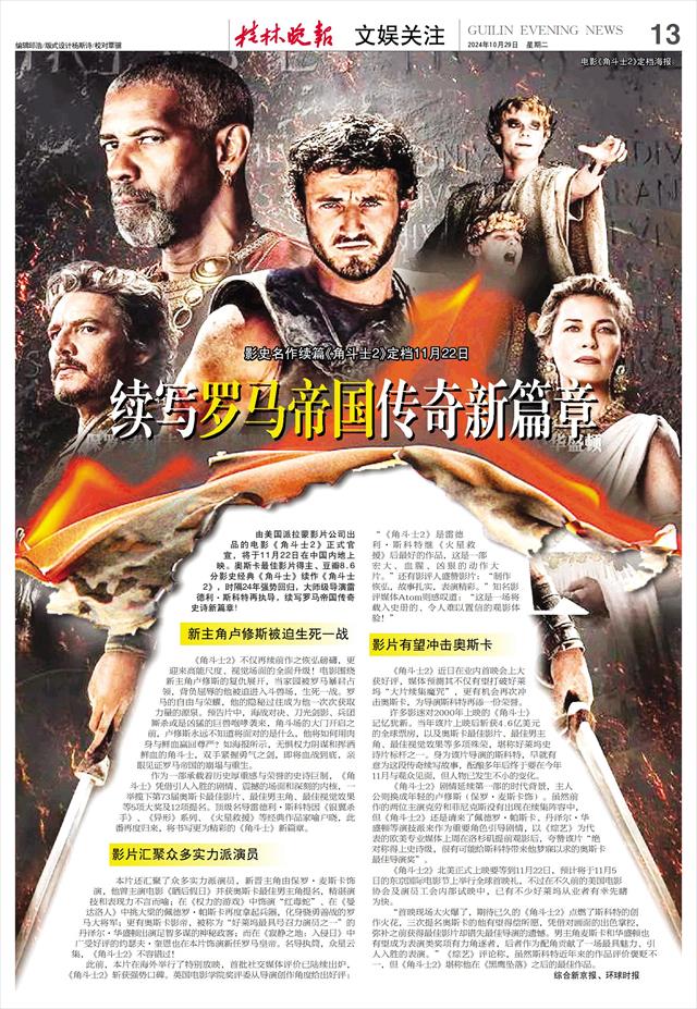 续写罗马帝国传奇新篇章   由美国派拉蒙影片公司出品的电影《角斗士2》正式官宣,将于11月22日在中国内地上映。奥斯卡最佳影片得主、豆瓣8.6分影史经典《角斗士》续作《角斗士2》,时隔24年强势回归,大师级导演雷德利·斯科特再执导,续写罗马帝国传奇史诗新篇章!