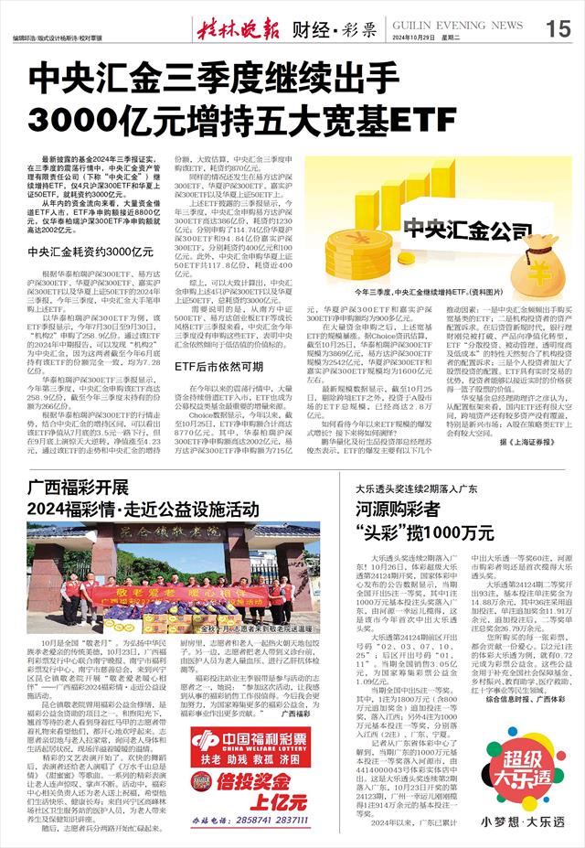 3000亿元增持五大宽基ETF   最新披露的基金2024年三季报证实,在三季度的震荡行情中,中央汇金资产管理有限责任公司(下称“中央汇金”)继续增持ETF,仅4只沪深300ETF和华夏上证50ETF,就耗资约3000亿元。