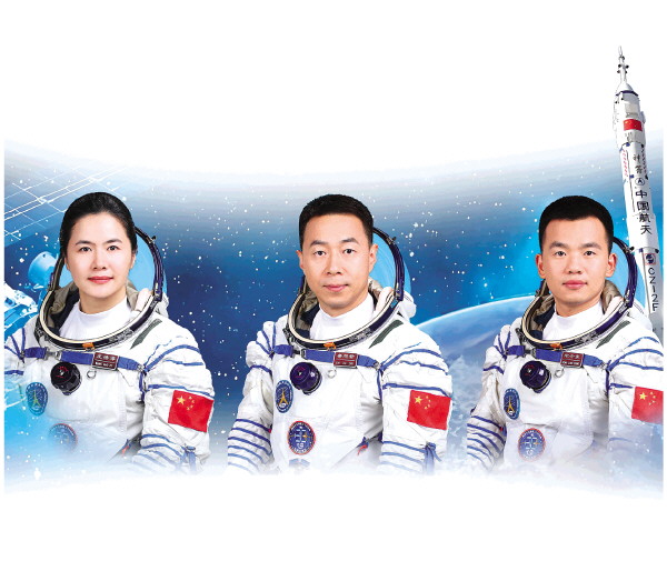 神舟十九号航天员蔡旭哲(中)、宋令东(右)、王浩泽。 新华社发
