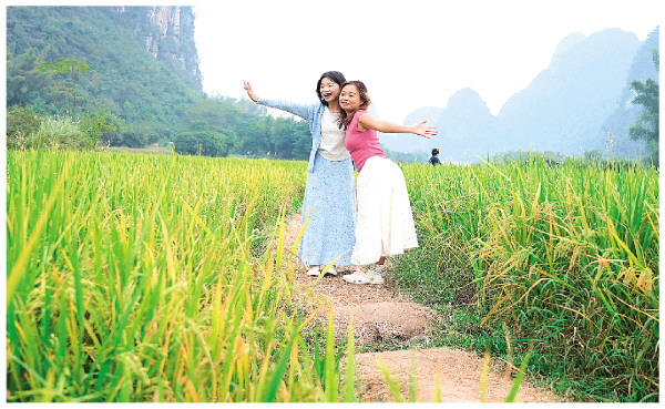 11月3日,两位湖南游客在阳朔遇龙河畔的稻田田埂上尽情拍照,陶醉于迷人的秋日风光之中。记者邢刚 摄