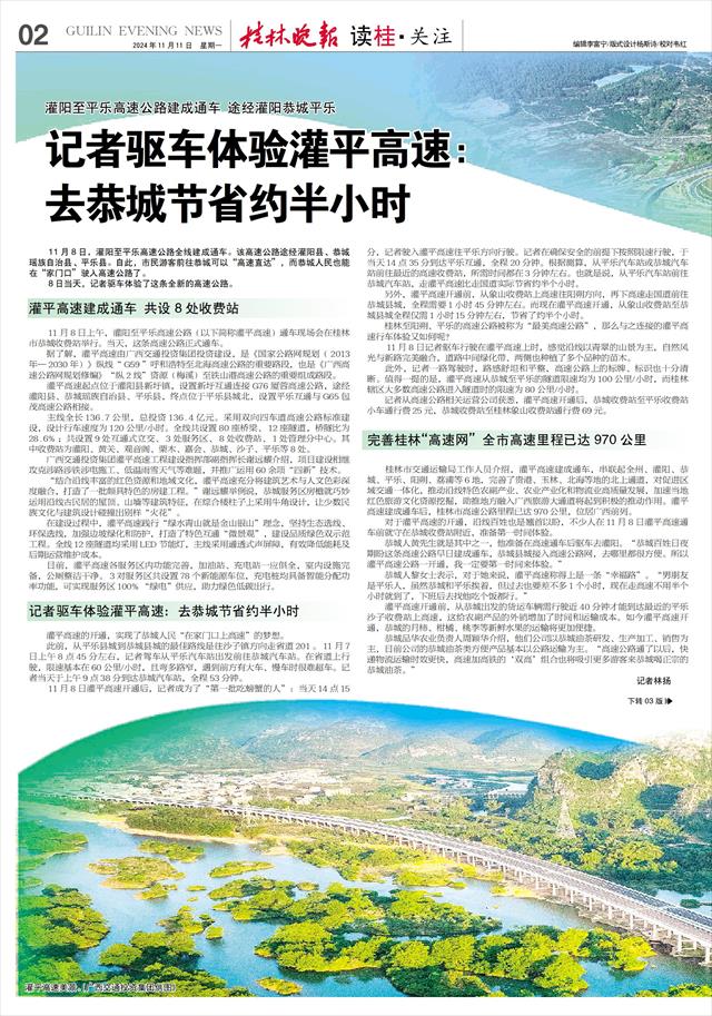 11月8日,桂林灌阳至平乐高速公路(简称“灌平高速”)建成通车,桂北山区与北部湾港再添一条“交通大动脉”。