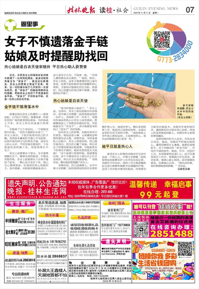 近日,市民苏女士的微信好友列表中新增了一位特别的朋友,她亲切地将其备注为“宋金子”。提及这位新朋友,苏女士的赞美之情溢于言表。原来,这一切的缘分始于几天前的一次游泳经历,是“宋金子”的敏锐观察和及时提醒,帮助苏女士找回了不慎遗落的金手链。“宋金子”不但拾金不昧,还是一位热心的白衣天使。