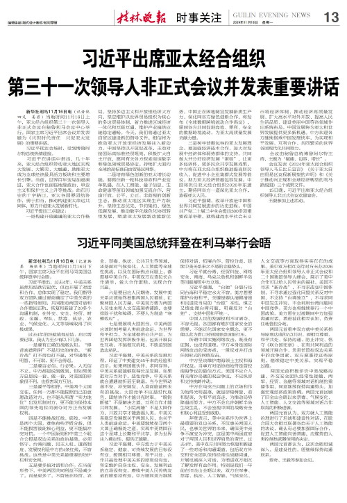 第三十一次领导人非正式会议并发表重要讲话   新华社利马11月16日电(记者倪四义 姜岩)当地时间11月16日上午,亚太经合组织第三十一次领导人非正式会议在秘鲁利马会议中心举行。国家主席习近平出席会议并发表题为《共担时代责任 共促亚太发展》的重要讲话。