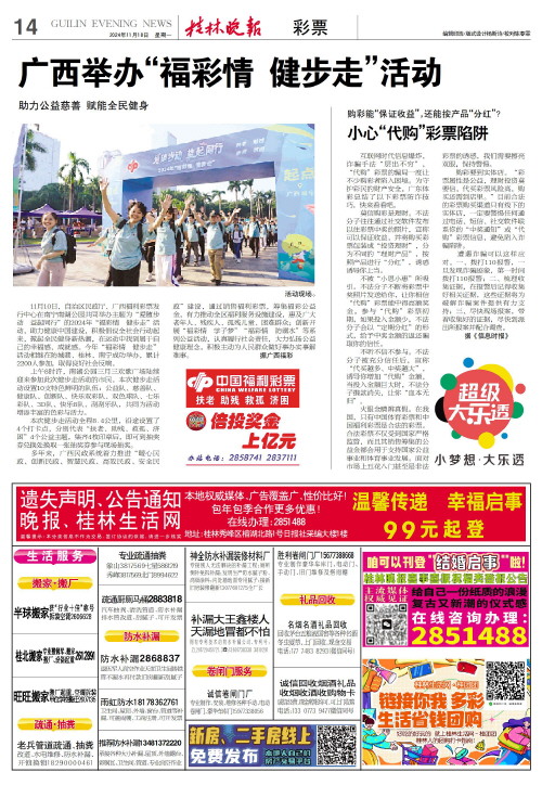 广西举办“福彩情 健步走”活动 助力公益慈善 赋能全民健身   11月10日,自治区民政厅、广西福利彩票发行中心在南宁南湖公园共同举办主题为“爱随步动 益起同行”的2024年“福彩情 健步走”活动,助力健康中国建设,积极倡议全社会行动起来,掀起全民健身新热潮,在运动中找到属于自己的幸福感、成就感。今年“福彩情 健步走”活动相继在防城港、桂林、南宁成功举办,累计2200人参加,取得良好社会反响。