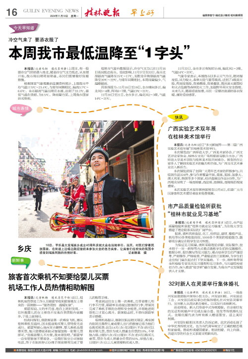 冷空气来了 要添衣服了 本周我市最低温降至“1字头”   本报讯(记者马翔 通讯员胡静)上周末,有一股弱冷空气悄悄潜入桂北,随着冷空气主力抵达,从本周开始,我市将出现明显降温,市民们需要做好保暖措施。
