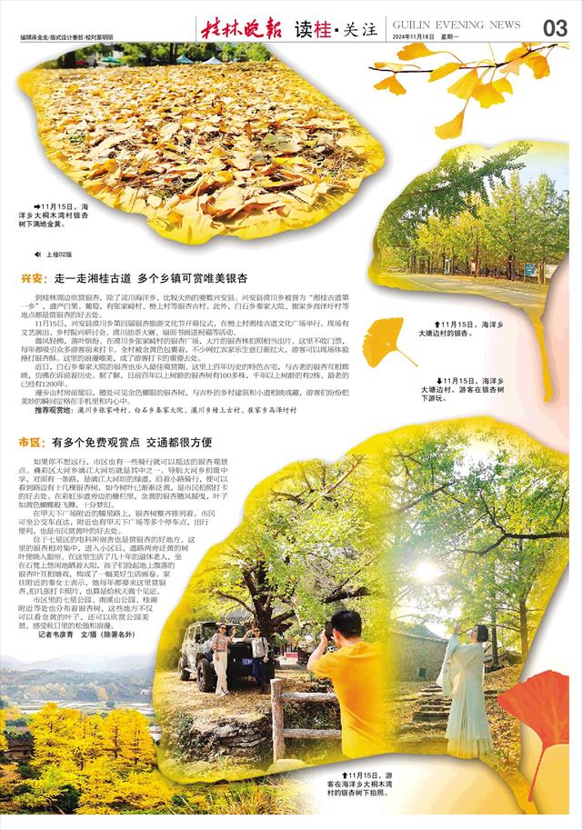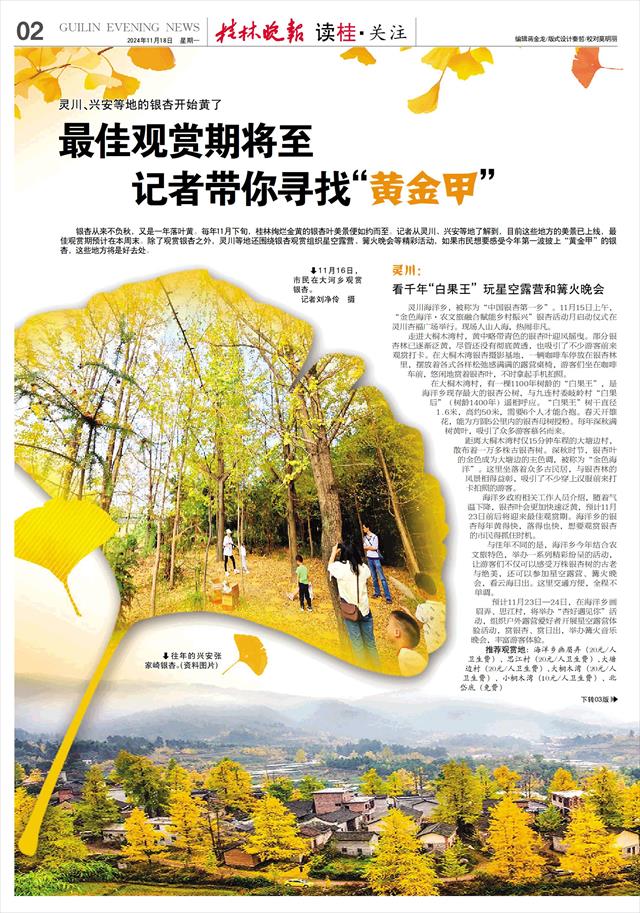 记者带你寻找“黄金甲”   银杏从来不负秋,又是一年落叶黄。每年11月下旬,桂林绚烂金黄的银杏叶美景便如约而至。记者从灵川、兴安等地了解到,目前这些地方的美景已上线,最佳观赏期预计在本周末。除了观赏银杏之外,灵川等地还围绕银杏观赏组织星空露营、篝火晚会等精彩活动,如果市民想要感受今年第一波披上“黄金甲”的银杏,这些地方将是好去处。
