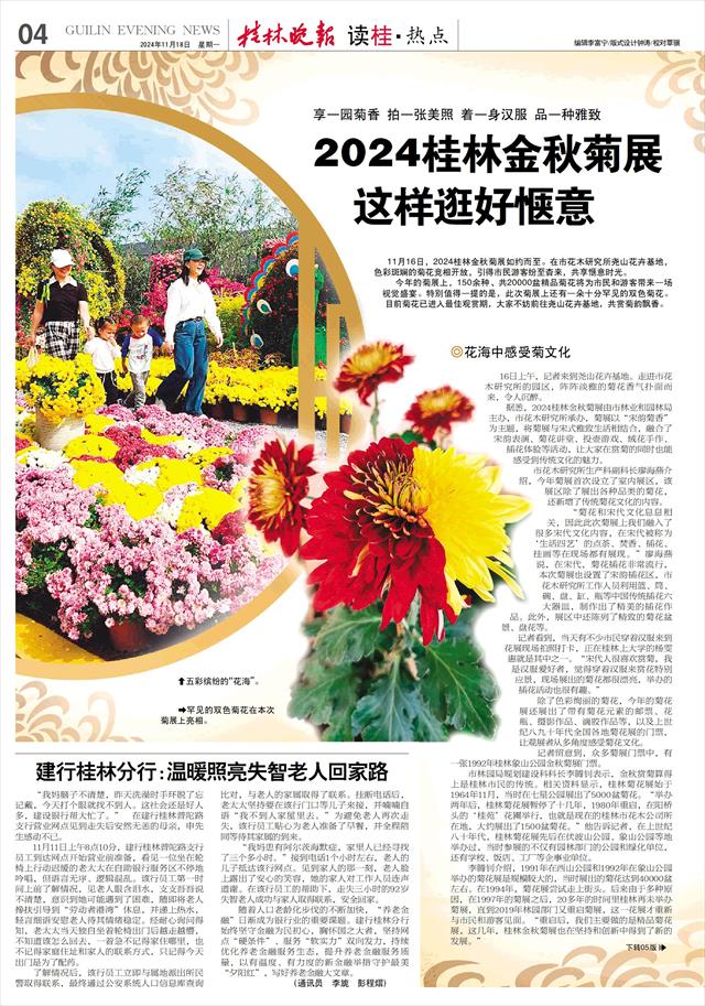 这样逛好惬意   11月16日,2024桂林金秋菊展如约而至。在市花木研究所尧山花卉基地,色彩斑斓的菊花竞相开放,引得市民游客纷至杳来,共享惬意时光。
