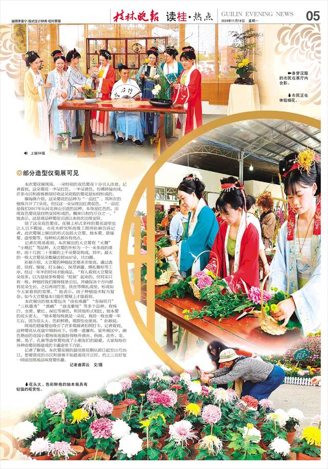 记者看到,当天有不少市民穿着汉服来到花展现场拍照打卡,正在桂林上大学的杨雯惠就是其中之一。“宋代人很喜欢赏菊,我是汉服爱好者,觉得穿着汉服来赏花特别应景,现场展出的菊花都很漂亮,举办的插花活动也很有趣。”