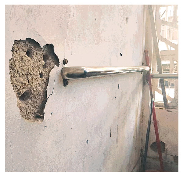 前段时间,黄奶奶发现二楼楼道的扶手出现了松动,后来由于墙体原因,有一部分直接脱落,还带下来一些墙皮和墙灰。路过的居民曾经尝试将扶手重新装回去,但墙体的螺丝处已经松动,墙体内砂石脱落,无法安装。有居民建议,宿舍楼是老房子,墙壁里头都是砂石,用钉子安装进去容易再次脱落,干脆拆除算了。