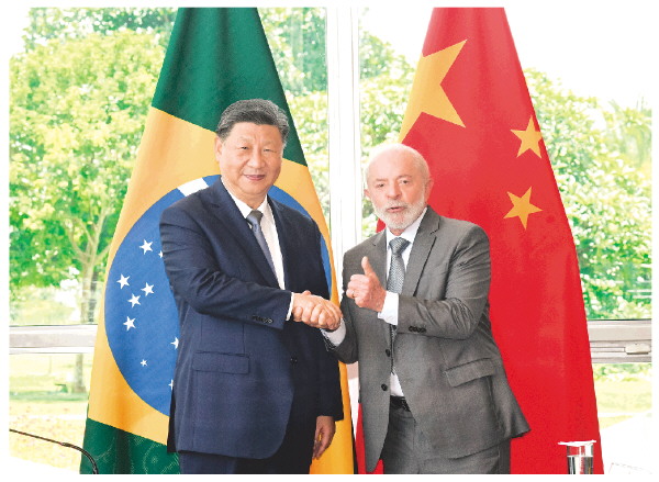 习近平指出,很高兴在中巴建交50周年这个具有重要历史意义的年份访问巴西。刚才卢拉总统为我举行最高礼遇的隆重欢迎仪式,充分体现了对中巴关系的高度重视以及对中国人民的深情厚谊,令我深受感动。中国和巴西是东西半球两大发展中国家。回首过去50年,中巴关系跨越山海,探索出发展中大国相互尊重、互利友好、合作共赢的正确相处之道。巴西是首个同中国建立战略伙伴关系的国家、首个同中国建立全面战略伙伴关系的拉美国家。近年来,在我和卢拉总统战略引领下,两国日益成为命运与共的可靠朋友、共促和平的积极力量,中巴关系正处于历史最好时期,不仅增进了两国人民福祉,也维护了广大发展中国家共同利益,壮大了全球南方的力量和声音,为世界和平稳定作出突出贡献。