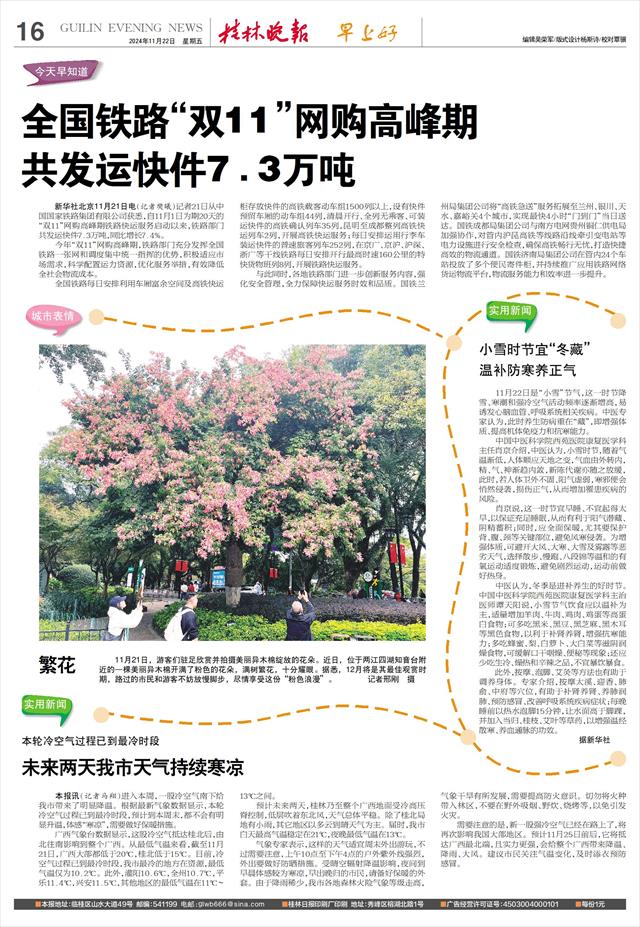 需要注意的是,新一股强冷空气已经在路上了,将再次影响我国大部地区。预计11月25日前后,它将抵达广西最北端,且实力更强,会给整个广西带来降温、降雨、大风。建议市民关注气温变化,及时添衣预防感冒。