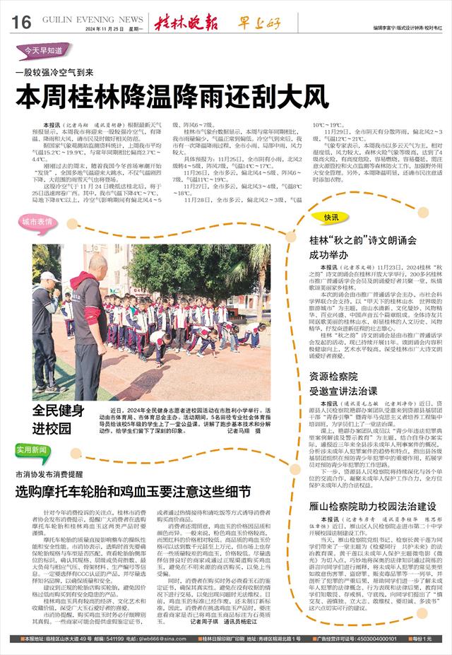 这股冷空气于11月24日晚抵达桂北后,将于25日迅速席卷广西。其中,我市气温下降4℃~7℃、局地下降8℃以上,冷空气影响期间有偏北风4~5级、阵风6~7级。