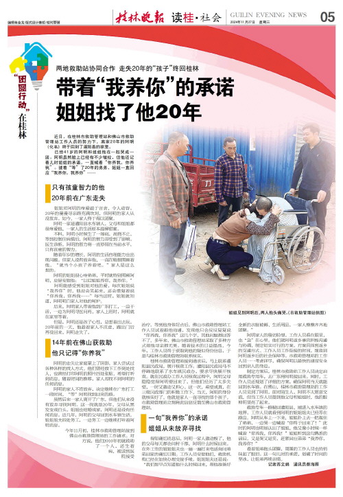 近日,在桂林市救助管理站和佛山市救助管理站工作人员的努力下,离家20年的阿明(化名)终于回到了灌阳县的家里。