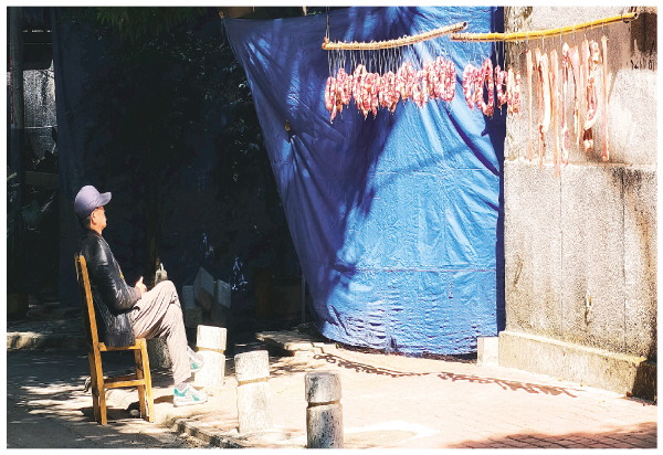 近日,记者在铁西里看到,一位市民趁着这几天的好天气,在太阳底下晾晒着香肠,而他本人则在一旁悠闲地享受着温暖的阳光。 记者滕嘉 摄