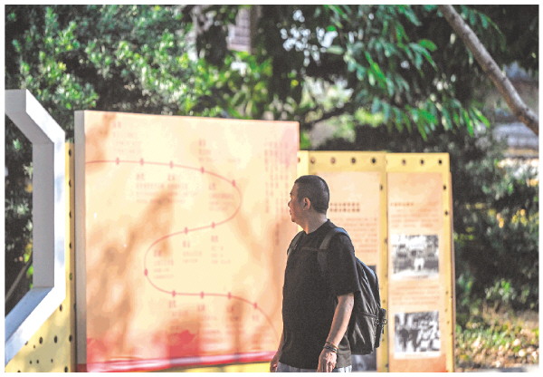3日傍晚,在正阳路步行街通往王城景区门口的步道上,一位游客被有关靖江王城历史的展板所吸引,驻足了解桂林的历史文化。 记者滕嘉 摄