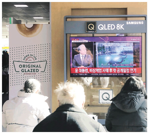 4日,在韩国首尔火车站,民众观看韩国媒体关于戒严令的新闻专题。新华社发
