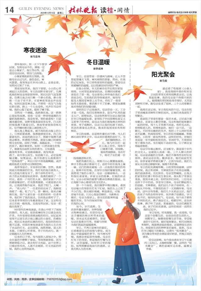 冬日,不再只是寒冷的象征,它承载着母亲的深情与牵挂,成为我心中最温暖的季节。每当寒风呼啸,我都会想起那些夜晚,母亲在灯光下的身影,想起她的叮嘱与关怀。这份温暖,如同冬日里的暖阳,始终照耀着我前行的道路,让我无惧人生的风寒。