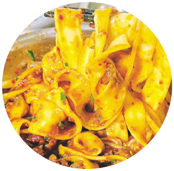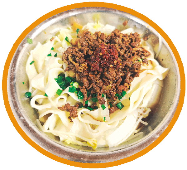 随着厨房那边“嗞啦”地一声响,一碗热气腾腾的油泼面就送到了记者面前。两指宽的面条上撒了一大勺肉末臊子,底下还有一层细细的葱花,经热油一浇,散发出浓郁的香气。将面条和配料仔细拌匀了,原本洁白的扯面一下子就成了酱色,令人食欲大增。