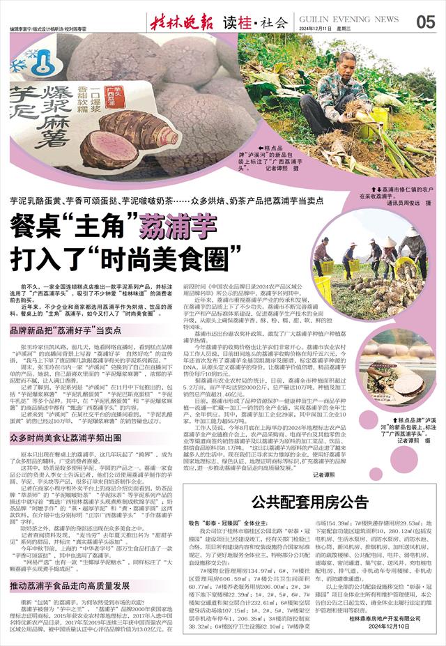 工作人员说,今年8月底在上海举办的2024年地理标志农产品荔浦芋全产业链推介会上,农产品采购商、电商平台及其他零售企业等渠道商签约销售荔浦芋及以荔浦芋为原料的加工菜品、饮品、烘焙食品原料共8.1万吨。“这让以荔浦芋为原料的产品走进了越来越多人的生活中。现在我们正寻求实力雄厚的企业,使用好荔浦芋国家地理标志、绿色认证、地理证明商标等标识,扩充荔浦芋的品牌效应,进一步推动荔浦芋食品走向高质量发展。”