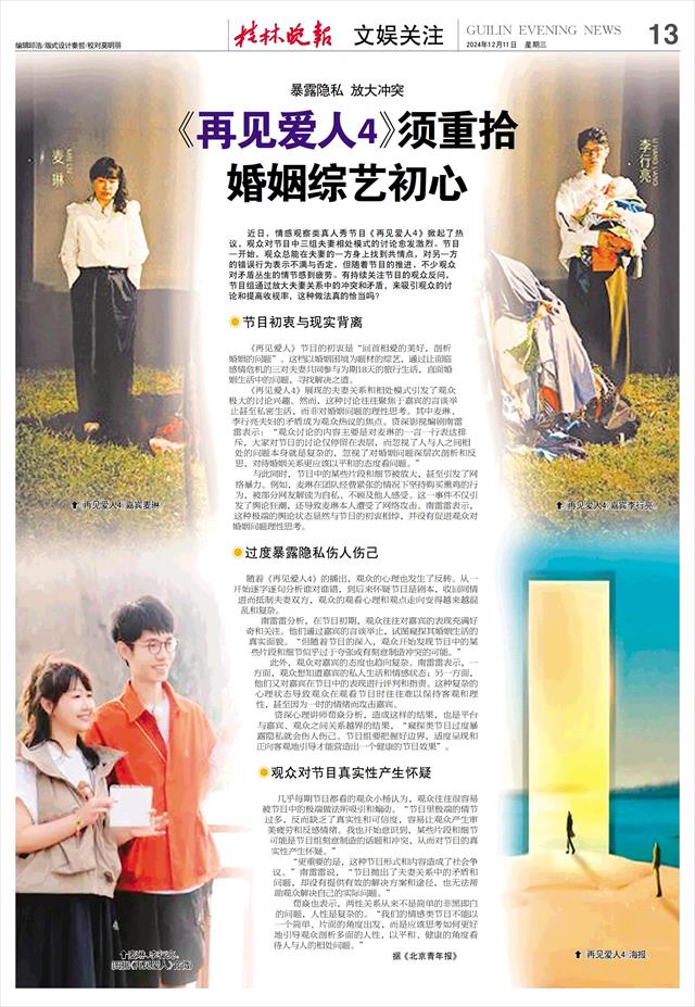 近日,情感观察类真人秀节目《再见爱人4》掀起了热议,观众对节目中三组夫妻相处模式的讨论愈发激烈。节目一开始,观众总能在夫妻的一方身上找到共情点,对另一方的错误行为表示不满与否定,但随着节目的推进,不少观众对矛盾丛生的情节感到疲劳。有持续关注节目的观众反问,节目组通过放大夫妻关系中的冲突和矛盾,来吸引观众的讨论和提高收视率,这种做法真的恰当吗?