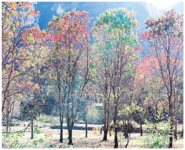 近段时间,阳朔县葡萄镇报安村委报安村的乌桕树叶从绿变黄,再从黄变红,像是大自然不小心打翻了调色盘,把山林渲染得五彩斑斓。图为12月15日下午,阳光照耀下多彩的乌桕树叶。 记者邢刚 摄