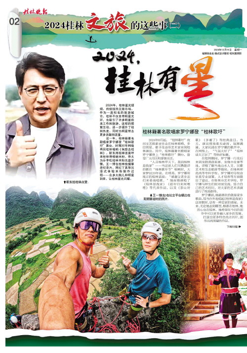 2024,桂林有星   2024年,桂林星光熠熠,持续搅热文旅市场。作为一座知名的旅游城市,桂林不仅自带明星光环,也吸引了许多明星前来工作和旅游。这样的频繁互动,进一步提升了桂林热度,同时为明星带去更多话题和流量。