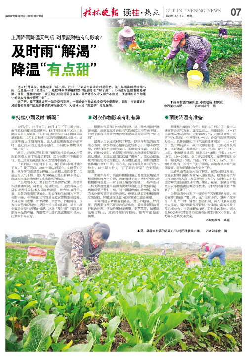 12月7日、12月10日、12月11日下了三场小雨。市气象局的相关数据显示,12月7日桂林市区24小时降雨量是4.5毫米;12月10日桂林市区24小时降雨量是3毫米。12月11日桂林市区的降雨量是2.5毫米。这三场降雨也伴随着降温,让人感觉更湿湿冷冷的同时,也让雨后的土地变得湿润,田间的农作物及时“解了渴”。