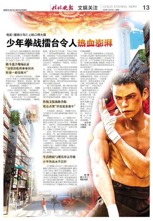 12月14日,由孙海鹏执导,张苗监制的原创现实主义国漫动作喜剧电影《雄狮少年2》正式公映。三年前那个挑战擎天柱的少年又回来了,这一回他要用传统武术,为自己,为家人,争一口气。