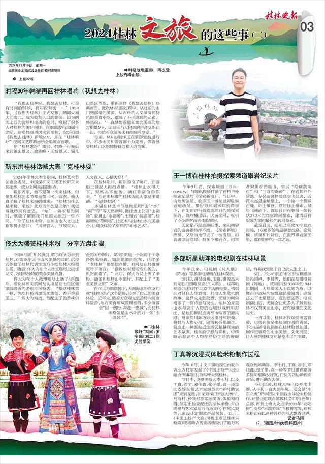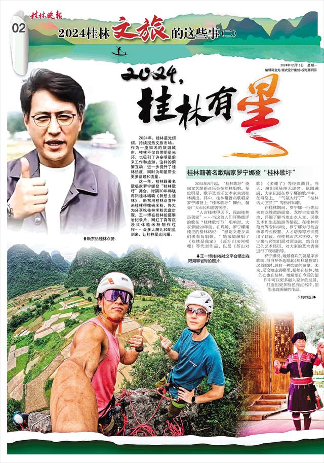 这一年,桂林籍著名歌唱家罗宁娜登“桂林歌圩”舞台,时隔30年韩晓再回桂林唱响《我想去桂林》,靳东用桂林话直呼来桂林得嗦碗米粉,佟大为分享吃桂林米粉光盘步骤,王一博在桂林拍摄攀岩纪录片,网红丁真等沉浸式体验米粉制作过程……众多大腕儿和明星到来,让桂林星光闪耀。