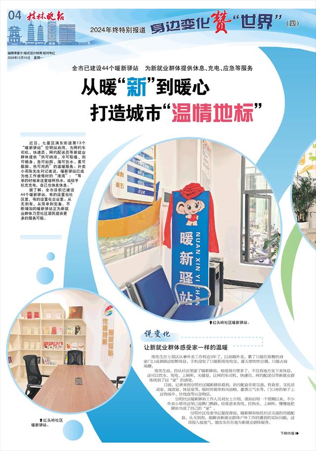 近日,七星区漓东街道第13个“暖新驿站”空明站启用,为网约车司机、快递员、网约配送员等新就业群体提供“热可纳凉、冷可取暖、雨可栖身、急可如厕、渴可饮水、累可歇脚、伤可用药”的温暖服务。外卖小哥陈先生对记者说,暖新驿站已成为他工作疲倦时的“港湾”:“等单的时候来这里接杯热水,或给手机充充电,自己也休息休息。”