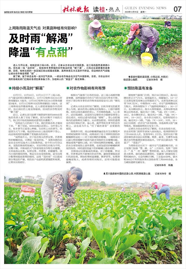 进入12月以来,桂林迎来三场小雨。近日,记者从市农业农村局获悉,这三场雨虽然是绵绵小雨,但也是一场“及时雨”,给桂林冬季种植的农作物及时地“解了渴”。小雨过后紧跟着的是寒潮。目前,桂林北部的一些区域已经出现霜冻现象。虽然体感又冷又湿并不舒适,但这样的天气却能让部分农作物变得更“甜”。