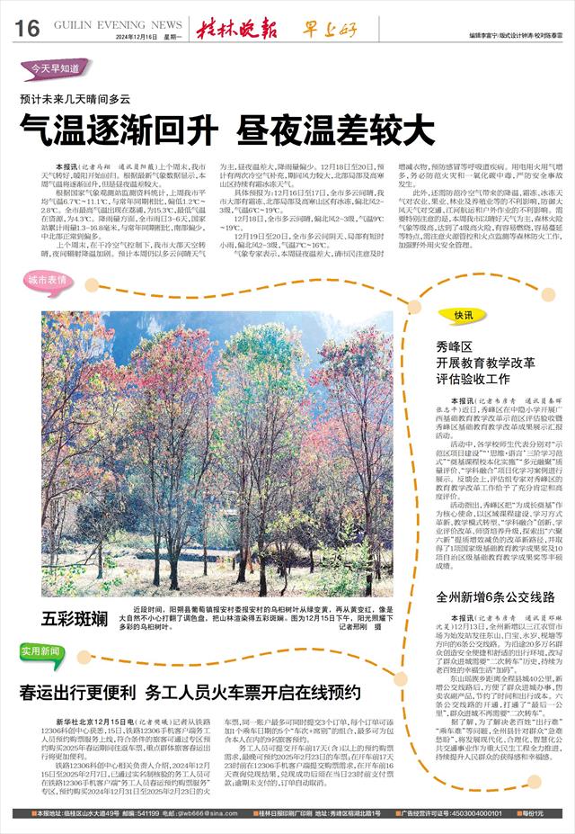 近段时间,阳朔县葡萄镇报安村委报安村的乌桕树叶从绿变黄,再从黄变红,像是大自然不小心打翻了调色盘,把山林渲染得五彩斑斓。图为12月15日下午,阳光照耀下多彩的乌桕树叶。 记者邢刚 摄