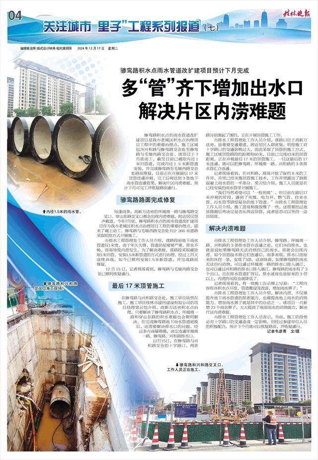 在骖鸾路与兴和路交会处,施工单位依然在施工。施工单位桂林市建昌建设有限公司的项目经理梁云恺介绍,高新万达旁积水点治理,只要解决了骖鸾路积水点,环城南一路和穿山东路的积水难题也会顺利解决。在完成骖鸾路地下雨水管道更换后,还需要解决排水口的问题。经过多方商量勘测,决定连通环城南一路、骖鸾路、兴和路排水口。
