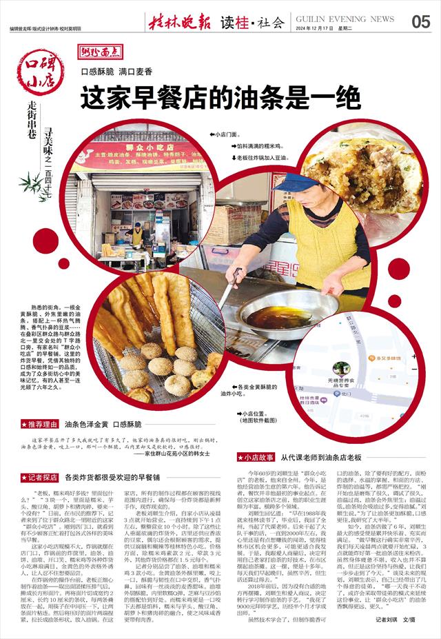 熟悉的街角,一根金黄酥脆、外焦里嫩的油条,搭配上一杯热气腾腾、香气扑鼻的豆浆……在叠彩区群众路与群众路北一里交会处的T字路口旁,有家名叫“群众小吃店”的早餐铺,这里的炸货早餐,凭借其独特的口感和始终如一的品质,成为了众多街坊心中的美味记忆,有的人甚至一连光顾了六年之久。