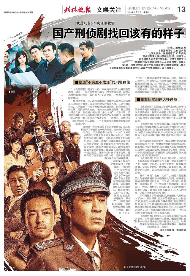 《我是刑警》昨晚催泪收官 国产刑侦剧找回该有的样子   昨晚,刑侦大剧《我是刑警》在央视八套上演大结局。该剧还原了30年间我国多起刑事大案的侦破全过程,刻画了一批忠魂热血的公安干警形象,记录了刑侦工作随着科技发展的种种变迁。《我是刑警》面貌朴实,是一份情理交织、具有广度与厚度的“刑事侦缉档案”,填补了荧屏重案纪实类剧集的空白,让国产刑侦剧找回了该有的样子。