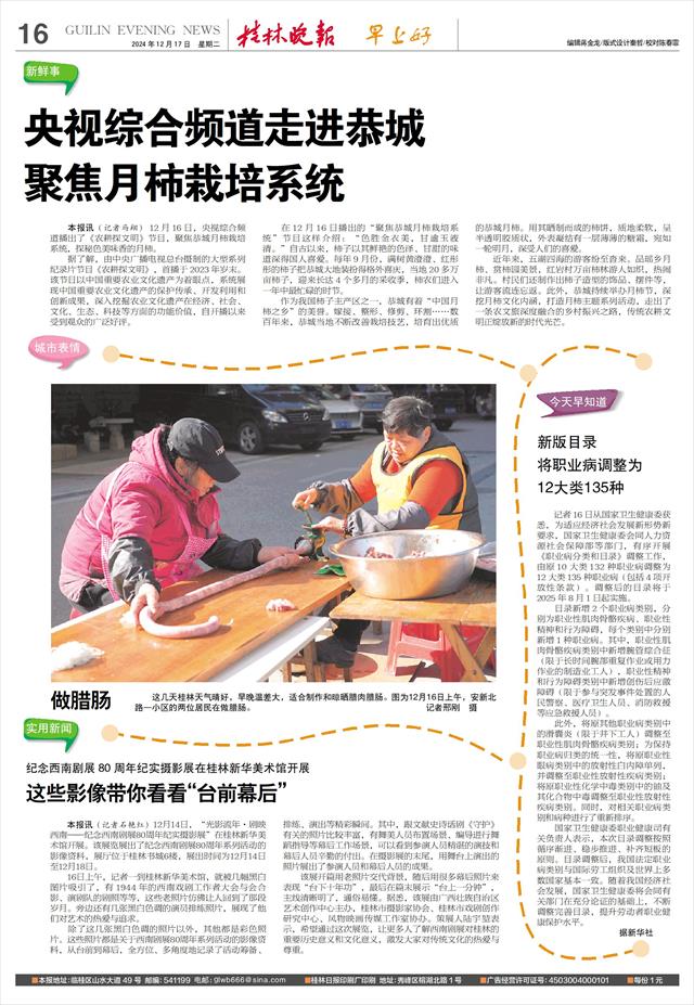 聚焦月柿栽培系统   本报讯(记者马翔)12月16日,央视综合频道播出了《农耕探文明》节目,聚焦恭城月柿栽培系统,探秘色美味香的月柿。