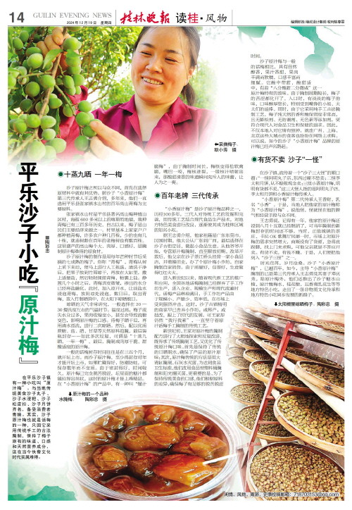 在平乐沙子镇有一种小吃叫“原汁梅”。与当地传统美食沙子丸子、沙子水浸粑、沙子松皮扣、沙子月饼齐名,备受消费者青睐。其实,沙子原汁梅也就是话梅的一种,只因它采用传统手工的古法腌制,保持了梅子原有的味道、口感和天然营养成分,这在当今快餐文化时代实属难得。