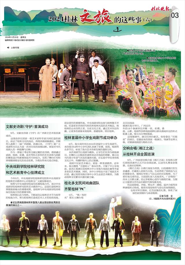 这一年,2024桂林艺术节如约向市民和八方游客献上戏剧盛宴、纪念西南剧展80周年暨第八届全国话剧优秀剧目展演收获满堂彩、《龙隐居》获评全国话剧优秀剧目展演“优秀剧目”、中央戏剧学院桂林研究院和艺术教育中心在我市挂牌成立……一朵朵“戏剧之花”在山水间绽放。